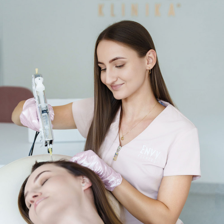 Mezococktails contain growth factors, stem cells, vitamins, amino acids and zinc. The doctor will pick the best solution for you to maximally support hair growth. The treatment is combined with other procedures and it’s generally a good idea to repeat it 5 to 12 times depending on various factors. Hair loss usually stops after five treatments and hair start growing after ten treatments. A visible improvement in head skin and hair quality is usually present after 1 to 3 months. However, this always depends on what problems we’re dealing with.