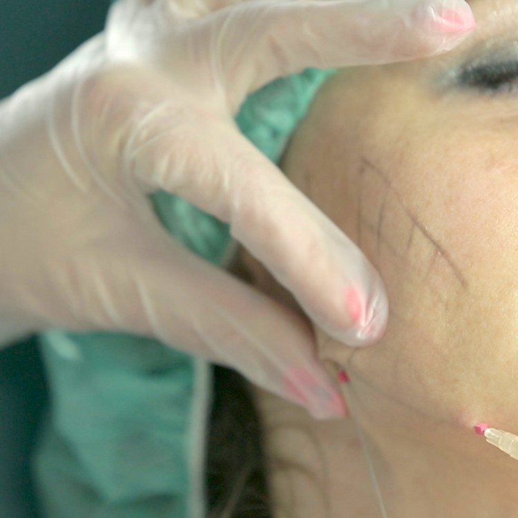 The procedure is performed under local anesthesia. After sufficient anesthesia, the doctor inserts the sutures into the subcutaneous tissue with a special cannula. The procedure itself is painless, the client feels only a pressure.